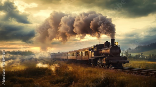 A vintage steam train chugs through a lush green field, billowing smoke into a dramatic sunset sky.
