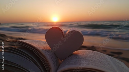 Close-up of heart-shaped book pages by a sunset beach, blending literature and love with a peaceful ocean view.