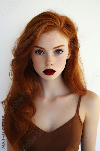 beautiful redheaded woman with long hair. She has large eyes and very pale skin. Her lips are painted with dark red lipstick. She is wearing a brown dress
