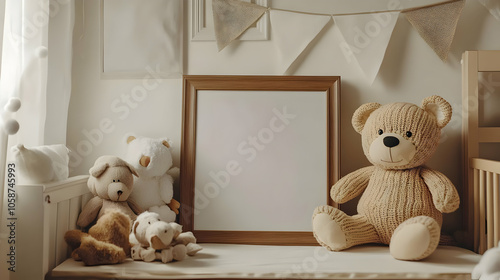 Photo of Teddy Bear and Stuffed Animals in Baby Nursery with Empty Picture Frame