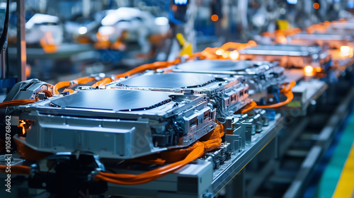 W fabryce o nowoczesnym wyglądzie widać linie montażowe, gdzie odbywa się na masową skalę produkcja ogniw baterii elektrycznych.