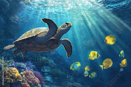 A sea turtle glides through crystal-clear water, surrounded by vibrant yellow fish and a colorful coral reef. Sunlight streams down, creating a peaceful underwater atmosphere.
