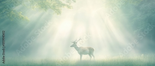 A deer is standing in a field of grass with the sun shining on it. The image has a peaceful and serene mood, as the deer is alone in the open field, surrounded by nature