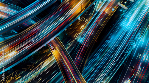 dynamic aerial shot of busy highway interchange showcasing vibrant light trails from moving vehicles. intricate patterns of roads create visually striking scene