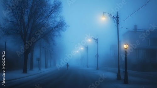 A street scene during twilight, with soft blue streetlights illuminating a quiet road, and a person walking alone, creating a sense of solitude and reflection typical of Blue Monday