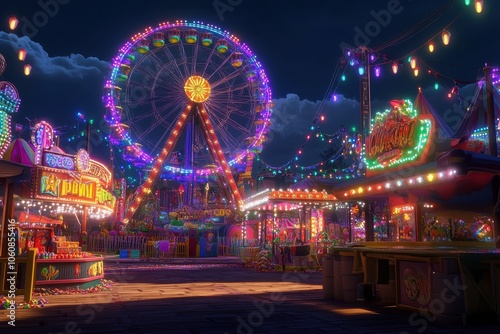 A carnival scene with colorful rides, games, and a Ferris wheel lit up with bright lights.