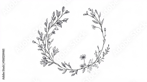 107.A detailed, hand-drawn floral circle frame featuring fine branches, dainty leaves, and small blossoms, arranged symmetrically in a wreath-like design, offering a minimalist and sophisticated look.