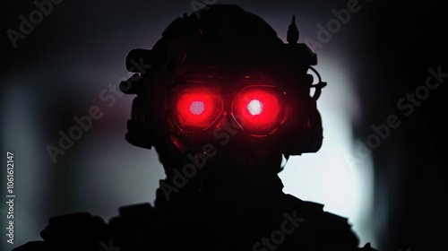 A shadowy figure wearing a tactical helmet with red glowing goggles.