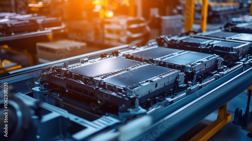 W fabryce z linią produkcyjną ogniw bateryjnych do samochodów elektrycznych, z bliska widać szczegóły procesu.
