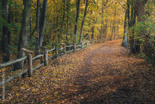 Płotek przy leśnej ścieżce w miejskim parku w Warszawie