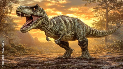 Tyrannosaurus Rex Dinosaur Roaring in Sunset Landscape