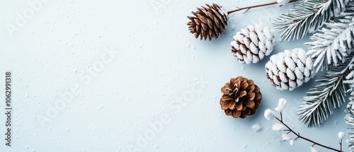 Winter scene with snow-covered pinecones and evergreen branches on a light blue background. Perfect for holiday or seasonal design projects.
