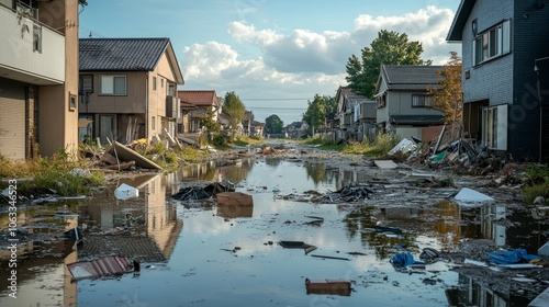 A flooded residential neighborhood with debris scattered along the waterlogged street and damaged houses under a partly cloudy sky