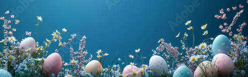 A vibrant spring banner featuring pastel Easter eggs and white blossoms on a teal background, perfect for seasonal sales and celebrations. Copy space.