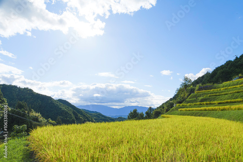 Blue autumn sky, rice fields, ears of rice just before harvest