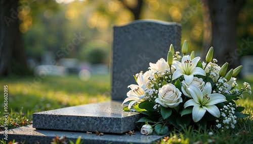 Peaceful cemetery scene with a gravestone and a bouquet of white lilies and roses