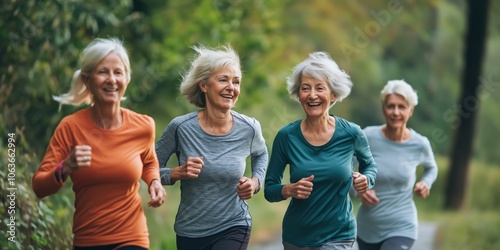 Four women are running in a forest, smiling and enjoying their time. Scene is cheerful and positive, as the women are having fun while exercising