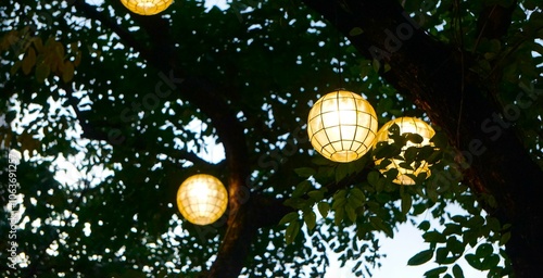 Ozdobne oświetlenie zawieszone na drzewie. Świecące lampy na drzewie wśród liści. Romantyczne oświetlenie widziane wieczorną porą.