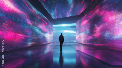 テクノロジーやAIの進化を感じさせるインタラクティブな体験空間を歩く人物