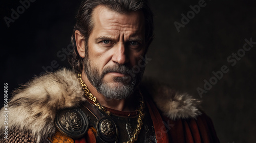 Mężczyzna w stroju Wercyngetoryksa, z długimi, falującymi włosami i zbroją, która emanuje potęgą i siłą które oddają ducha starożytnej Galacji.
