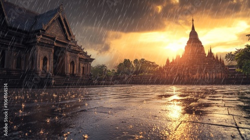 A dramatic sunset casts a golden glow over an ancient temple in Thailand, as a downpour of rain falls upon the grounds.
