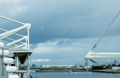 A Passenger Aircraft Departing London City Airport In The United Kingdom, flying over the Royal Victoria Docks.