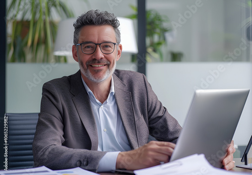 Zadowolony biznesmen dojrzały mężczyzna w biurze z laptopem – profesjonalizm, zaufanie i pozytywne relacje w środowisku biznesowym
