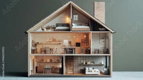 2410_080.miniature house cross-section render, high-resolution interior details, scaled-down furniture, multiple floors, roof structure, chimney, lighting design, textured surfaces, photorealistic