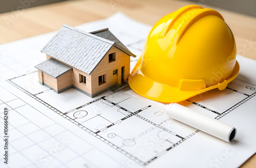 On the drawing of the floor plan of the house there is a model of a country house, and next to it lies a yellow construction helmet