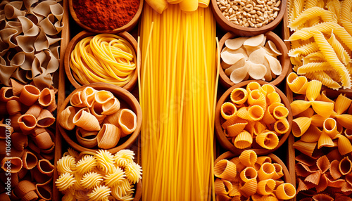 Vista desde arriba de diferentes tipos de pasta lista para ser cocinada.