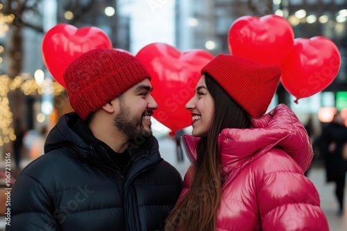 Couple in winter wear with red heart balloons. Valentine's Day street romance concept