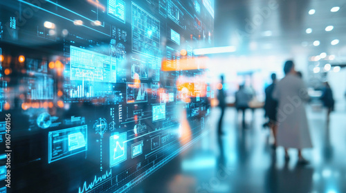 Abstract view of a modern hospital nurse station with glowing screens and busy staff in action