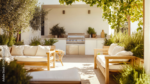 A serene outdoor patio with comfortable wooden seating, lush plants, and a modern grill, creating a perfect space for gatherings and relaxation on a sunny day