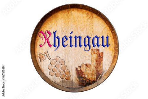 Isolated sign with Rheingau (Rheingau wine region) engraved, arranged with old wooden wine barrel