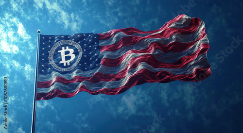 Bandera de Estados Unidos ondea en un asta y sobre las estrellas se aprecia el logo de Bitcoin. En la parte inferior las monedas se apilan rápidamente para formar una pequeña montaña de dinero.