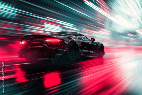 motion blur digital illustration of an exotic sports car, driving through cyberpunk neon-lit streets, sense of speed, epic