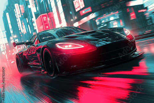 motion blur digital illustration of an exotic sports car, driving through cyberpunk neon-lit streets, sense of speed, epic