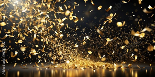 A shower of shimmering gold confetti falls upon a dark surface, creating a dazzling display of celebratory brilliance.