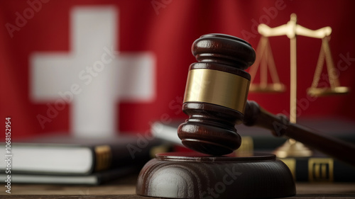 Law and justice concept. Switzerland flag standing at blurred angle behind judge's gavel standing on table. Background representing the Switzerland legal system.