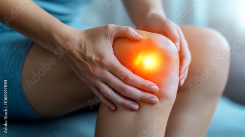 Woman suffering from knee pain, with a red hot spot highlighting the area of discomfort. The image evokes feelings of suffering and the need for pain relief