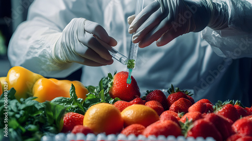 Scientist injecting nutrients into fruit, food biotech, enhancing nutritional value