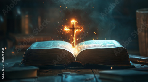 Otwarta książka, z której wyłania się świecący krzyż, tworząc tajemniczy i mistyczny klimat.