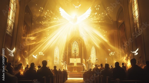 Pentecost celebration in church: church interior with apostles receiving the Holy Spirit, light rays illuminating, gentle flames, doves above, peaceful mood