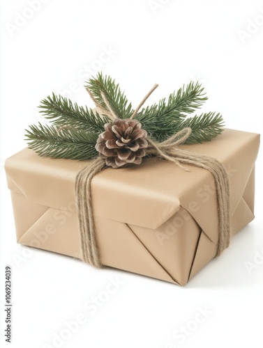 A beautifully wrapped gift adorned with pine branches and a pinecone, perfect for celebrating the holiday season