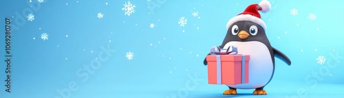 Chubby penguin joyfully waddles with a big christmas gift in a festive winter wonderland