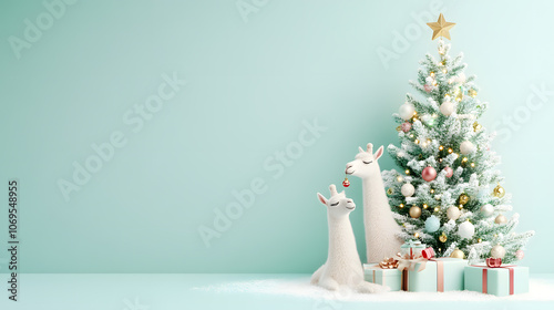 Llamas delight in decorating a christmas tree with gentle pastel tones for a joyful winter celebration