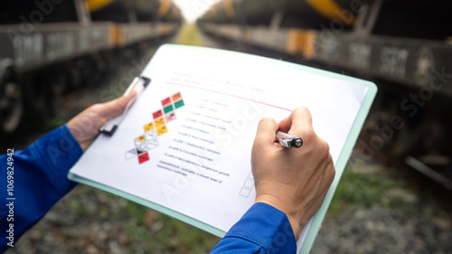 A worker is checking on chemical hazardous material checklist form with background of train tanker that prepare for transport. Industrial safety working practice concept, close-up and selective focus.