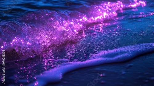 A close-up of a wave crashing on the shore at night, illuminated by purple light.