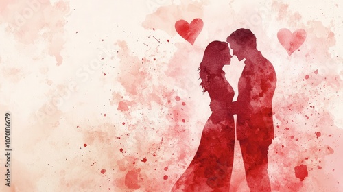 Romantic couple embracing in artistic red watercolor background during a celebration of love