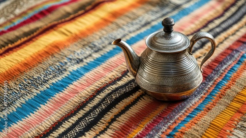 Emirati coffee pot on traditional Sadu textile. Copy space